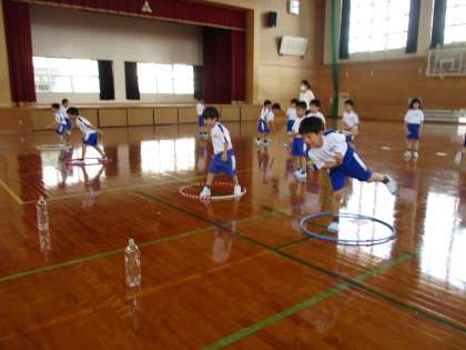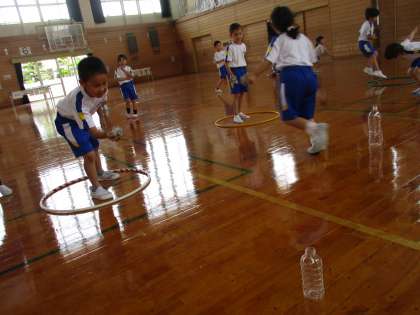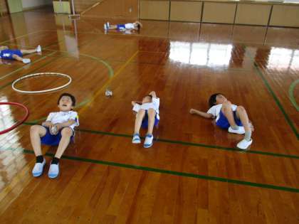 今日の体育は「ごろ寝でキャッチ」と「ペットボトルをたおせ」に挑戦しました。新聞紙を丸めてできる運動なので、とても簡単にできます。新聞紙を投げてペットボトルを倒す運動では、「あ〜はずれた!」「やったー!3回連続で倒せたよ!」と、子供たちは楽しそうに運動に取り組んでいました。
