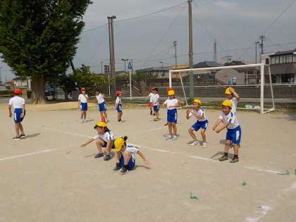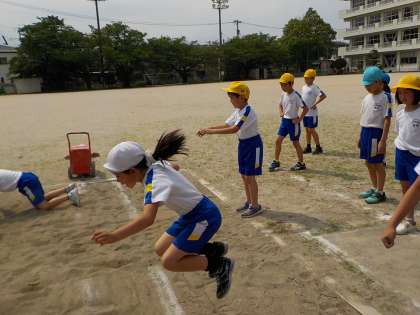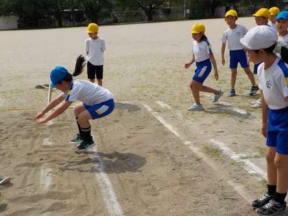 両足踏み切りで跳ぶ立ち幅跳び。腕の振り方や空中での姿勢等、ポイントを意識して練習をしました。砂場では、目標とするラインを決め、それを目がけて跳んでいました。