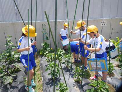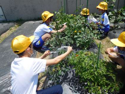 今日は、野菜に支柱を立てたり、わきめを摘み取ったり、虫がいるか調べたりしながら観察をしました。野菜とふれあうことが多く、「はやくおおきくなってね」といいながら育てていました。