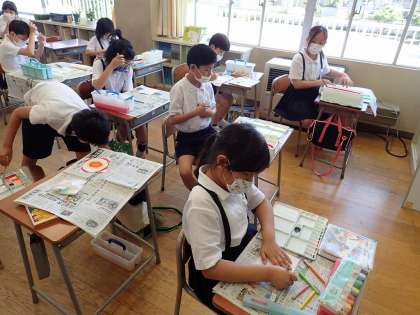 水彩絵の具を使って、色々な模様を描いています。今までに使ったことのあるローラーやブラシ、ストロー等も使って、工夫したものができあがってきています。どんどん描いて、みんなで鑑賞し合いたいと思います。