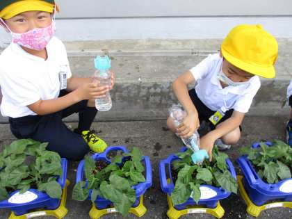 あさがおの本葉が大きくなり、数も増えてきました。鉢の中は、葉っぱが生い茂っています。子供たちは「困ったなあ、葉っぱばっかりで土が見えないから、水があげにくいよ〜」と困った様子。そこで今日は、間引きについて話し合いました。「葉っぱを切ったらかわいそうだよ」「じゃあ、根っこごと引っこ抜いて、また違う場所に植えてあげたらいいんじゃない?」と子供同士でアイディアを出し合いました。そして、間引いた苗はお家に持ち帰ることになりました。また、お家の方で育ててくださるとありがたいです。