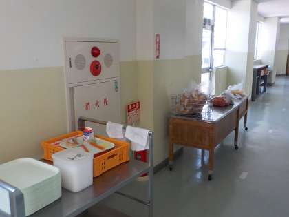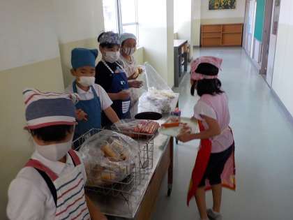 今日から給食が再開されました。子供たちは、お盆と牛乳を自分で持ち、給食当番がその他の食材をお盆に載せることで、衛生面に配慮した配膳の仕方で給食を配ります。