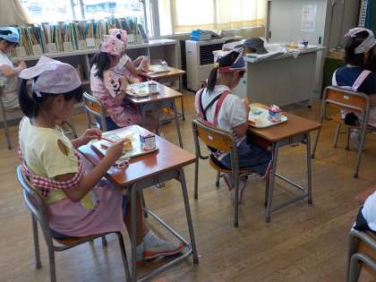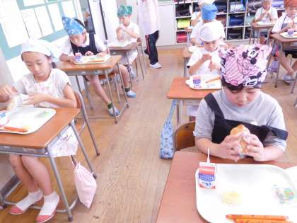 今日から給食が再開しました。学校でみんなそろって給食を食べることができ、嬉しそうでした。感染予防の対策をして、みんなでおいしくいただきました。