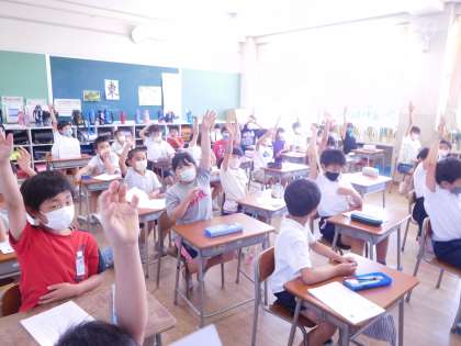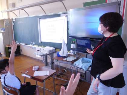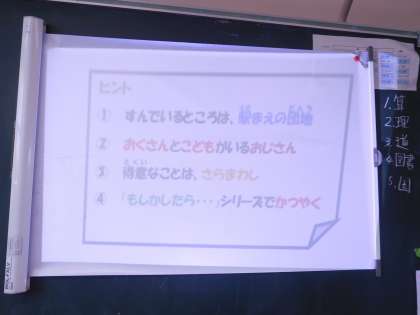 教室で、図書館オリエンテーションがありました。借りた本は学校で読むことや、本の返し方の変更など、本を借りる約束や図書室の利用の仕方をしっかり聞いてから、図書学習室へ向かいました。