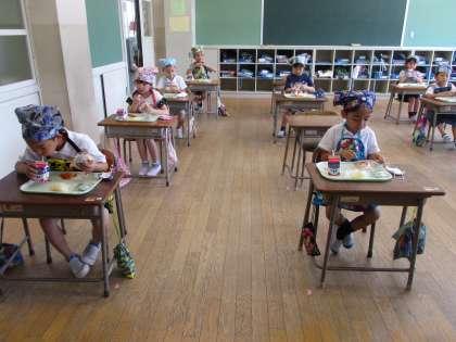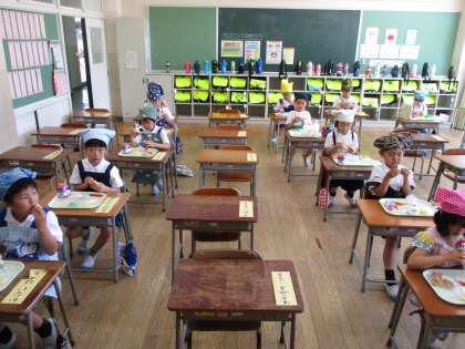 1年生の子供たちが心待ちにしていた給食が始まりました。朝登校するなり、教室に掲示されている給食献立表を見に行きメニューを読み上げるほど、楽しみにしていたようです。給食当番も自分たちで行い、配膳もスムーズでとても立派でした。