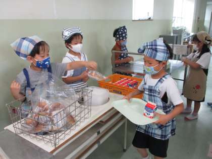 今週の給食当番です。さっと身支度を調え、みんなのために働いています。1年生は、分散して2つの教室を使って給食を食べているため、風通しのよい廊下で配膳をしています。そして、それぞれの教室へ入り、給食をいただいています。