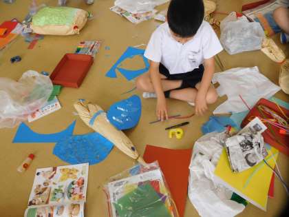図工の授業で「くしゃくしゃ ぎゅっ」をしました。