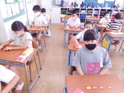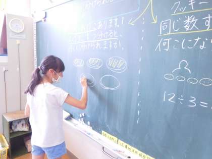 先週からわり算の学習が始まりました。今日は、「何人に分けられるか」を学習しました。おはじきを使ったり、図に表したりしてわり算の求め方を考えました。