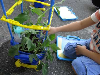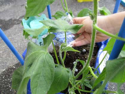 今日は、追肥をして、久しぶりにあさがおの観察カードを書きました。つるが伸びてきている鉢もたくさんあり、子供たちはまじまじと観察していました。「一番大きな葉っぱはぼくの手のひらくらいだよ!」「白い毛がたくさん生えていて、触ると気持ちいい!」など、五感をしっかり使ってじっくり観察していた子供たちでした。