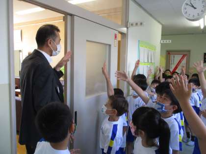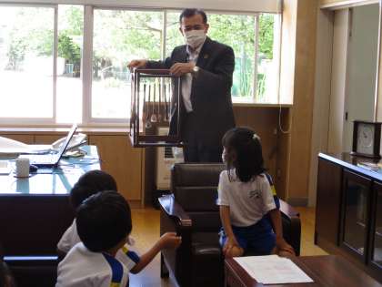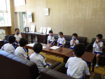 今日は、学校の1階と2階を探検しました。校長先生からのサプライズで、校長室の椅子に座らせてもらった子供たち。部屋中を見渡して、「それは、なんですか」と気になったものを質問していました。答えは、校長先生の大切な筆でした。なかなかできない貴重な体験をさせてもらい、子供たちは「うれしかった〜!」と喜んでいました。