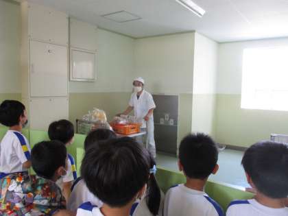 4時間目の最後に、ダムウェーダーに乗って運搬車が運ばれてくる様子を運よく見ることができました。調理員さんに質問したい気持ちを押さえて、給食の準備に取りかかった子供たちでした。後日、また質問タイムを作る予定です。