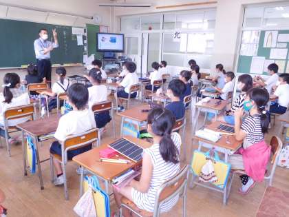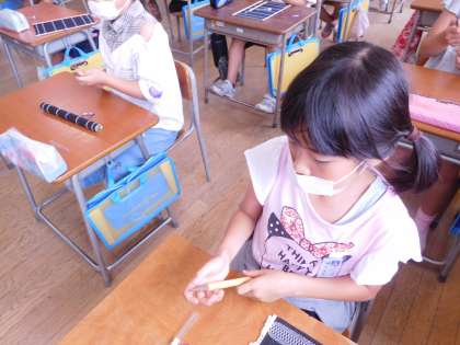 校長先生から毛筆用具の名前や筆のおろし方などを教わりました。子供たちは、筆のお話をとても真剣な様子で聞いていました。