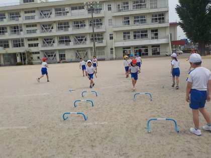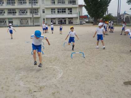 今日は、ミニハードルを使って、リズムよく助走し、高く飛び上がることを目当てにして練習しました。