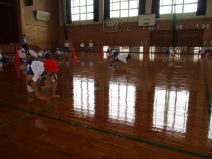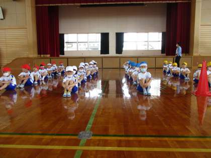 今日は、体育館でダンス体操を踊ってから、かけっこをしました。色団ごとに整列して座るということが素早くできるようになってきて成長を感じます。走ったり、スキップをしたり、片足けんけんをしたり、くま歩きをしたりと、色々なかけっこを楽しみました。