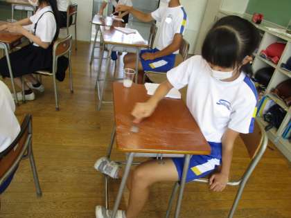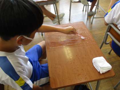 家庭科では、「クリーン大作戦」を始めました。第1回目の今日は、そうじをすることには「快適」「耐久」「健康」の3つの意味があることを学習しました。その後、いつも使っている机をせっけん水につけた歯ブラシでこすり、汚れを確認しました。子供たちは「泡が茶色くなってきた!」「きれいだと思ってたのに、意外と汚れてる!」と、びっくりしていました。これからもっと「クリーン大作戦」を進めていきたいと思います。