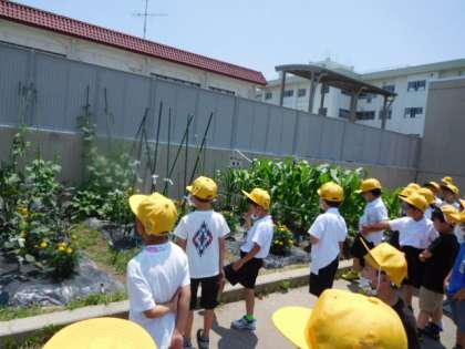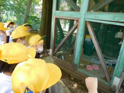 今日は、学校の外を探検しました。子供たちの中で、気になるものということで話題になった「二宮金次郎」の像を見たり、学校のアイドルうさぎのマーブルを見たりしました。また、駐車場の方へ移動すると、他の学年が育てている野菜畑がありました。駐車場の方は初めて行ったという子供も多く、「畑でぼくも野菜を育てたい!」「お家でもトマトを育てているよ」と、今まで知らなかった学校のことを知って、わくわくしている子供たちでした。