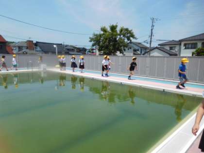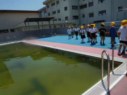 次は、みんなが見に行きたいと大人気だったプールへ行きました。初めて見るプールは、想像以上に大きかったようです。みんなびっくりしていました。今年度はプール学習はありませんが、この大きなプールに入ることができる日を心待ちにしている1年生です。