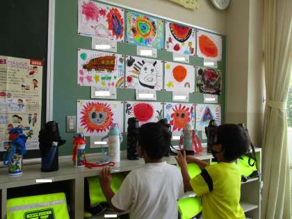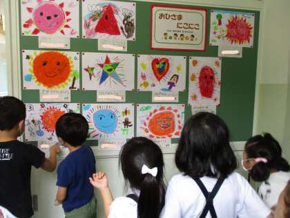 「おひさまにこにこ」の絵を鑑賞しました。友達の作品のすてきなところを見つけて、カードに書きました。「おひさまの顔がかわいいね」「色がカラフルですてきだね」など、色々なすてきをみつけていました。