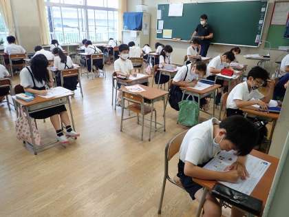 今日は、初めて外国語のテストがありました。聞き取って記入する問題など、特有の問題がありましたが、みんな集中してがんばっていました。