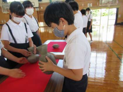 富山県で実際に掘り出された出土品をまじまじと見ながら、重さや手触りなどを確かめました。写真とは違う本物の迫力に魅了された子供たちでした。