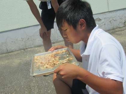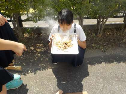 道具を使って、仲間と協力しながら一生懸命火を起こそうとする子供たち。