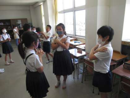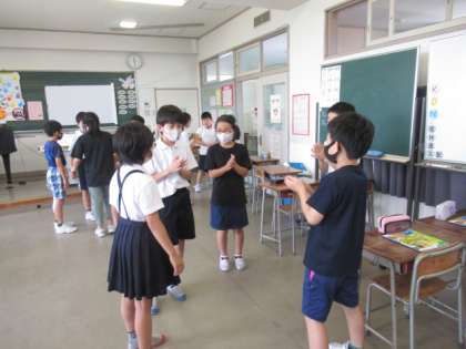 音楽では、ボディパーカッションに挑戦しています。体のいろいろな部分を使ってリズムに合わせてたたきました。班ごとに発表します。楽しみです!