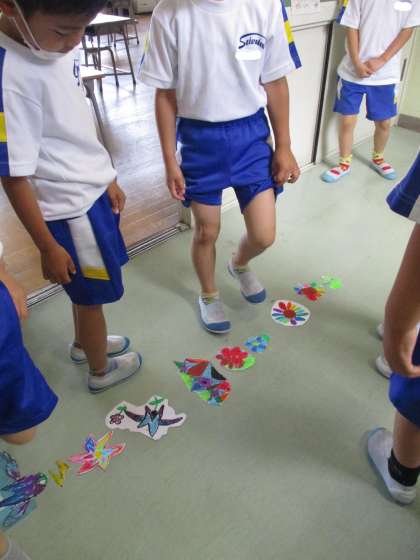国語科で学習したはなのみち。自分だけのオリジナルな花を描いて、みんなで花の道を作りました。「くまさんになった気分がする〜!」「みんなで描いたお花がきれいで、歩けてうれしかったよ。」とうれしそうな子供たちでした。