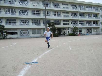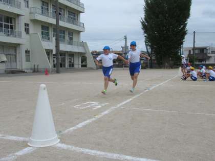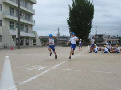 リレーの学習では、各団12人でバトンをつないでいます。少しでもタイムを縮めようと練習に取り組む子供たち。バトンパスの練習を始めてから、チーム全体で10秒以上もタイムを縮めている団もあります。