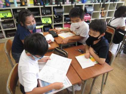 「ごみのしょりと利用」について学習しています。自分の調べた課題と分かったこと、考えを班の友達に話しています。ノートにかいた図を見せながら分かりやすく伝えようとしています。