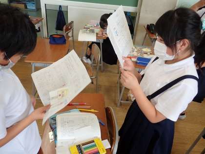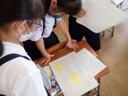 国語の学習で書いた報告書を友達に読んでもらい、意見や感想を集めました。友達の言葉を受けて、よりよいものにするために書き足したり、書き直したりしていました。