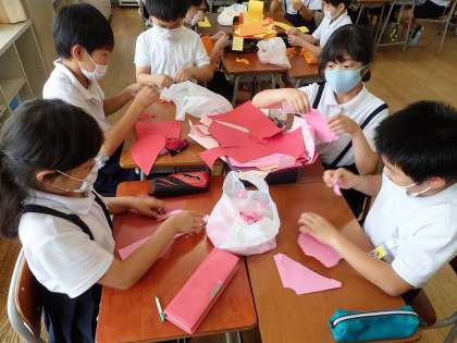 これまでに、学級目標を決め、どんなデザインにするか、どこに掲示するかなど細かい部分も話し合って決めてきました。いよいよ作成開始、大きな掲示に画用紙をちぎって貼るべく、協力して材料を整えています。