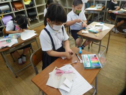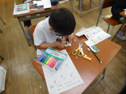 生活科の学習で、カエルの家族の特徴を想像しながらパッチンガエルを作りました。