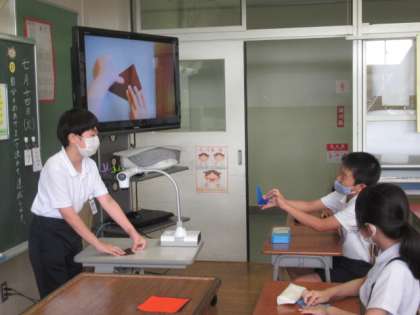 折り紙係のみなさんが、折り紙教室を開いてくれました。折り方をひとつひとつ丁寧に教えてあげていたのが印象的です。明日も続きをします。よろしくね!