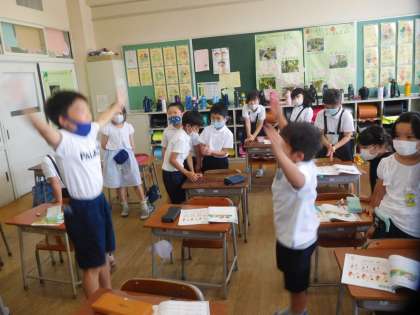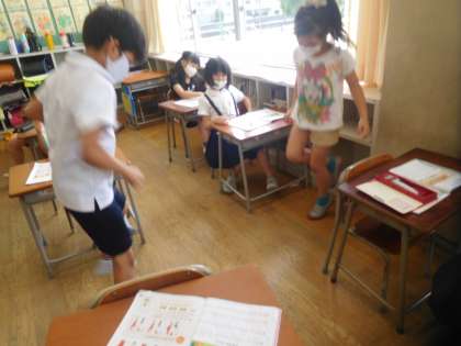 音楽の授業で、「たぬきのたいこ」の三拍子のリズムにあわせて、ペアでリズム遊びをしました。ペアの友達に触れない動きを考えながら、リズム遊びができました。