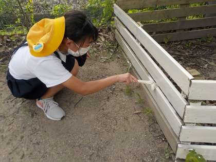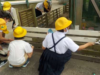 飼育栽培委員会では、桜っ子のみんながハッピースマイルになれるように、うさぎ小屋の改造を進めています。今日は、周りの柵にペンキで色づけをしました。みんな真剣に作業に集中していました。完成が楽しみですね。