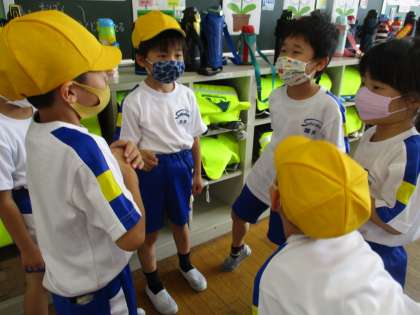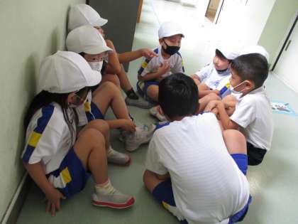 体育で、団対抗のリレーに取り組んでいます。休み時間も、「青団、集まって〜!」「赤団、作戦考えよう」と子供たちで声を掛け合い、それぞれの場所で集まって話し合っています。リレーで1位になるために、がんばっている子供たちです。