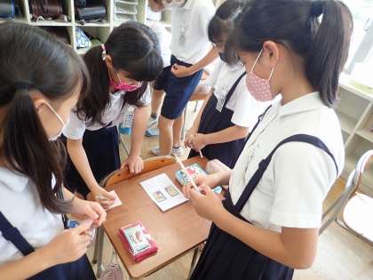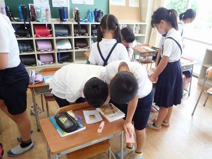 国語の学習で、本の紹介カードをつくりました。つくった紹介カードを見合い、友達へ感想を伝えました。書いてある文章を、それぞれが興味深そうに読んでいる様子が見られました。
