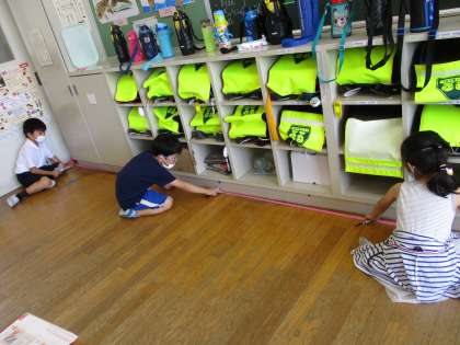 グループごとに分かれて、教室内のいろいろなものの長さを紙テープに写し取りました。教室の横の長さを測ったり、机の脚を測ったりしていました。