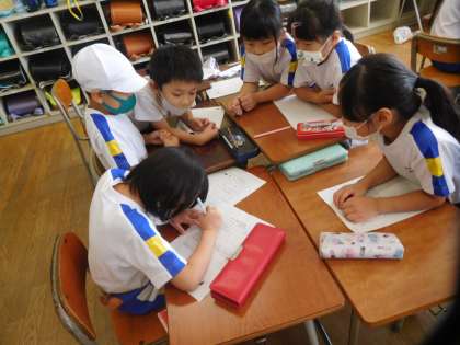 生活の授業で、これまでの野菜を育てて気づいたことを発表するために、各野菜のグループになり、すてきを見つける話し合いをしました。野菜の特徴をしっかり理解し、何を伝えたいか考えながらまとめていました。