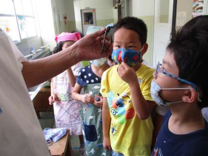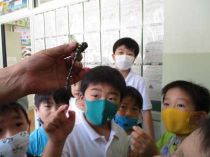 給食後の歯磨き中、子供たちが見つけたものとは・・・「オニヤンマ」です。洗面所と冷水機の間に挟まってしまい、抜けられなくなっているオニヤンマを可哀想に思った子供たち。先生に、オニヤンマを助けてもらいました。大きな体に、大きな目。子供たちは、まじまじとよく観察していました。