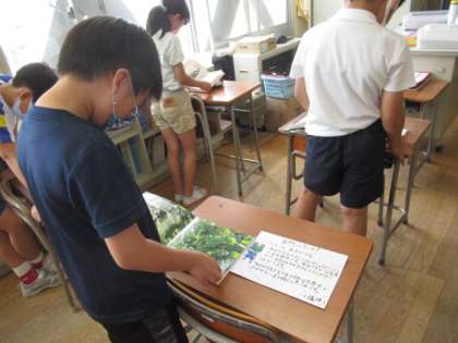 国語の学習で、おすすめのノンフィクションの本を紹介し合いました。本の帯やポップを自分で作り、おすすめポイントや、みんなに問いかけたいテーマ等を工夫してかきました。友達の紹介する本に興味津々な子供たちでした。