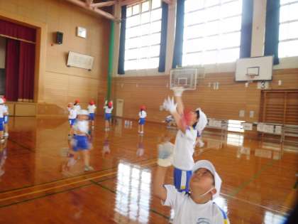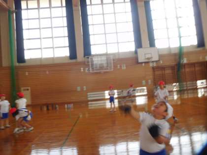 体育の授業で、玉入れをしました。2年生になって初めて上から投げる練習をしました。真上に投げることが難しい様子でしたが、だんだんコツを覚えて投げれるようになり、とても嬉しそうでした。