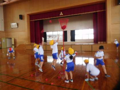 真上に投げたあとに、実際に玉入れをしました。上投げのコツをつかんできて、1分間で最高31個入れることができました。これから、何個入るか楽しみです。