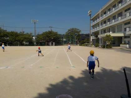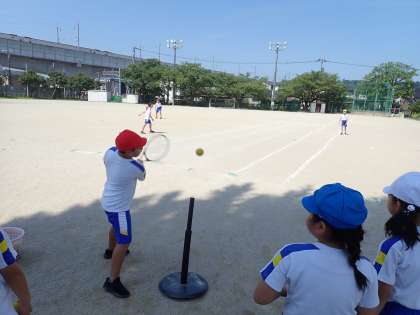体育の学習では、ベースボール型の「ラケットベースボール」を始めました。今日は、ルールを確認しながら、ラケットでボールを打ったり、守ったりする練習をしました。野球をしたことがない子も、楽しく取り組めたようです。