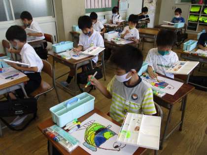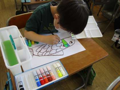 図工で、水彩用具を初めて使いました。クレヨンで思い思いの「せかいでたった1ぴきのさかな」を描き、水彩絵の具で色を塗りました。子供たちは、2色を混ぜると別の色ができることや、水の加減で色が変わることにびっくりしていました。はみ出さないように慎重に筆を動かし、オンリーワンの素敵な魚が仕上がりました。