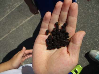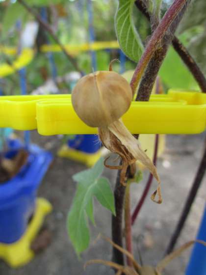 夏休みが終わり、あさがおも様変わりしてきました。よく見ると、子供たちの鉢の近くに黒くて小さな種がいくつも落ちています。夏休み前にできていた実が、緑色から茶色に変わり、たくさんの種がとれるようになりました。この種をどうしたいか、子供たちと話し合っていく予定です。