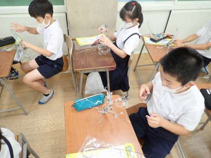 針金を使って、「立ち上がっているもの」を作っています。今日は、タワー型のものや生き物など、思い思いのものを一生懸命作っていました