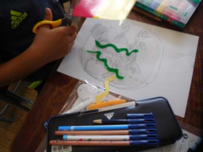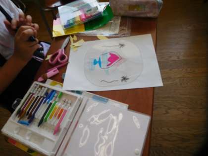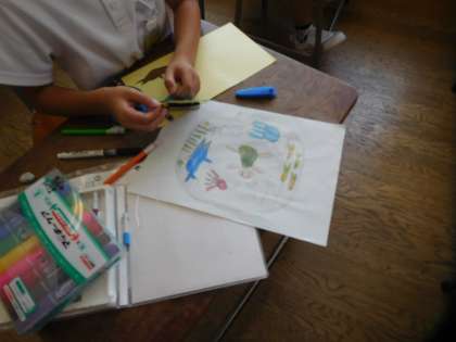 今日は、セロハンに自分の好きな模様を描くために、用紙に下書きをしました。楽しくて切り取りをして透明なうちわに張りはじめた人もいました。どんなふうに光を通すのかみんなわくわくしています。