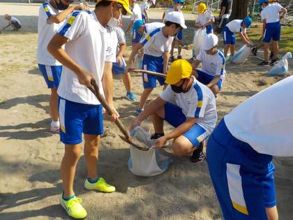 6年生は、朝活動の時間に、土のう作りとグラウンドの草むしりをしました。これは、来週行われる「キセキのハピスマオリンピック」に向けて、全校のみんなが気持ちよく参加できるようにとの思いで、5年生と合同で行ったものです。全校のイベントを自分たちの力で創り上げようという気持ちが表れています。
