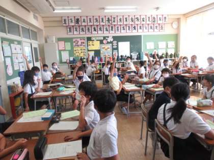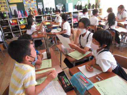 学活では、学級目標の達成に向けて、2学期にクラスでやってみたいことやみんなで気を付けていきたいことを話し合いました。おもしろそうなアイディアがたくさん出て、9月から楽しみになったようです。今日のようにみんなでアイディアを出し合ってすてきなクラスにしていってほしいです。